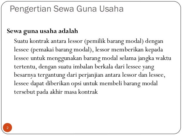 Sewa guna usaha adalah kegiatan pembiayaan dalam bentuk penyediaan barang modal baik secara guna usaha dengan hak opsi finance lease maupun sewa guna usaha. PENGERTIAN Pengertian sewa guna usaha menurut Keputusan Menteri Keuangan No. Bila sebuah perusahaan membutuhkan barang-barang modal seperti mesin kendaraan bermotor atau peralatan kantor perusahaan sewa guna usaha dapat membiayai barang-barang modal tersebut. Agar dapat tetap bertahan dalam dunia bisnis.