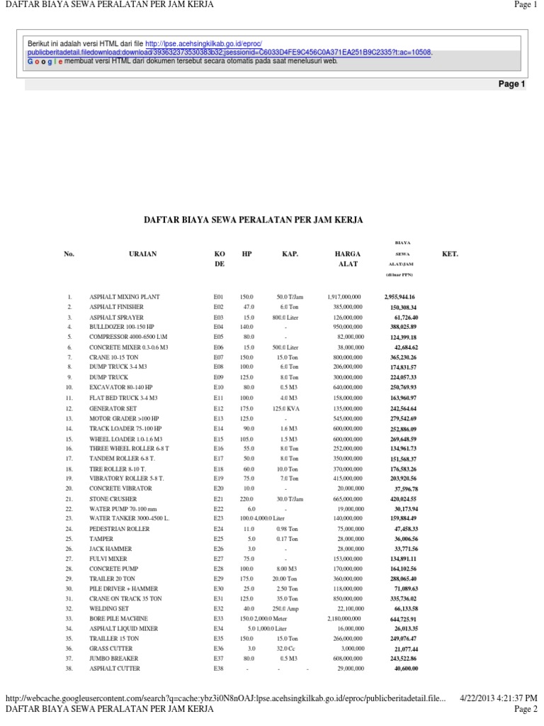 +5 Daftar Biaya Sewa Peralatan Per Jam Kerja Terbaru Tahun Ini. 84 61 84 menganggap dokumen ini bermanfaat 61 suara 50K tayangan 36 halaman. Daftar biaya sewa peralatan per jam kerja biaya no uraian ko hp kap harga sewa from aa 1.